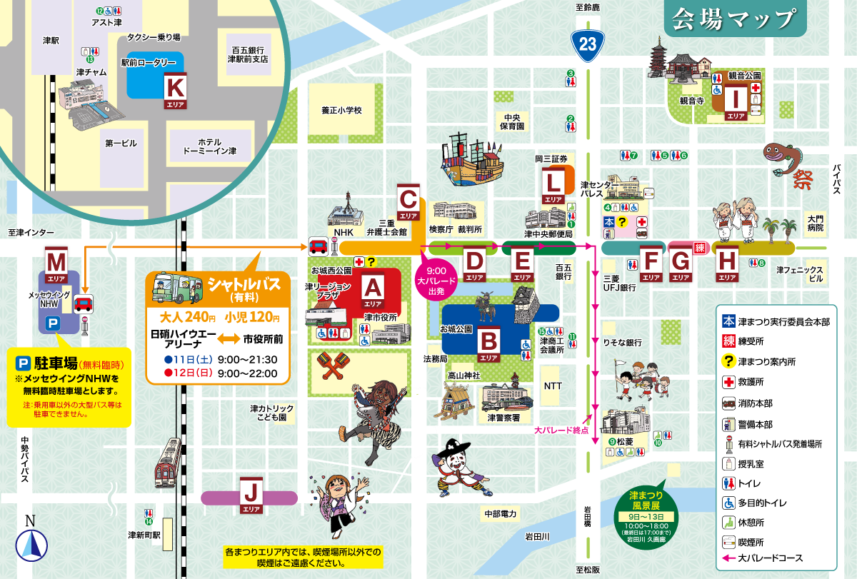 津まつり期間中、左上記表示のお店はトイレ又は休憩に御協力いただいています。