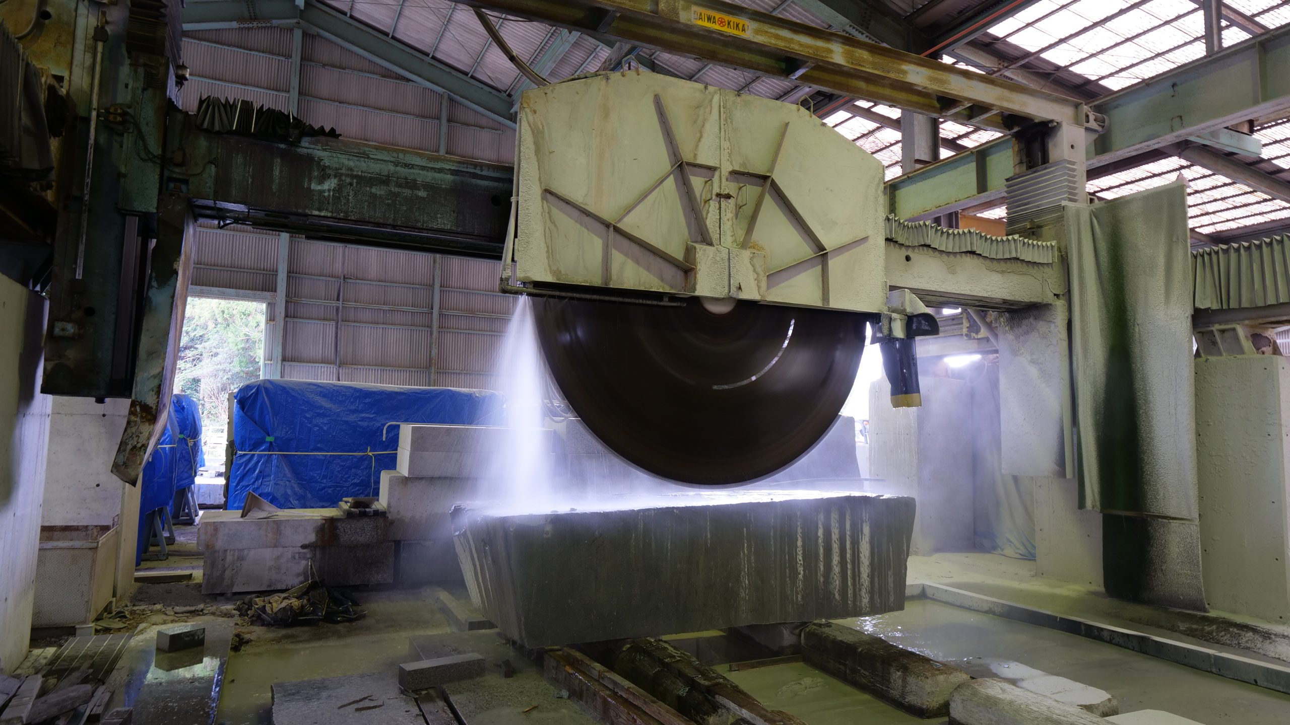 鈴鹿の工場には世界の石が並んでおり、加工に使う大きな刃も見ごたえがあります。工場見学も随時受付中です。